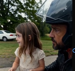 The biker’s face shifts—