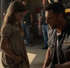 A low radio hum fills the dim garage—tools clink softly, dust drifting through warm light from the open door—