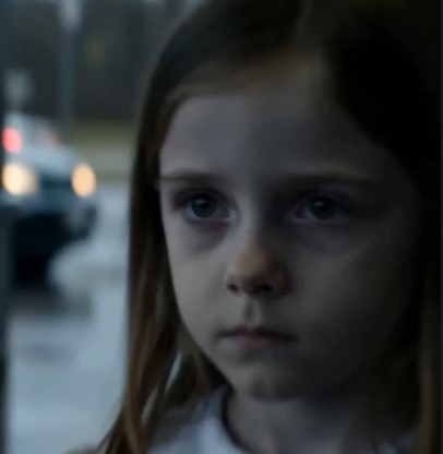 She stood completely still beside the gas station door, a tiny pale girl no older than six, while cars passed behind her and strangers walked around her like she wasn’t even there. The camera snap-zoomed into her empty stare. Wind moved strands of hair across her face, but she didn’t blink. A biker slowing near the pumps noticed her, removed his sunglasses, and frowned. Kind eyes beneath a rough face. He stepped closer. The girl looked up at him and asked softly, “Can you help me buy milk… for my baby brother?” The question hit wrong. Too calm. Too practiced. The biker glanced around. No parents. No one calling for her. No panic anywhere except the one building quietly rising in his chest. Quick cuts—tiny fingers gripping a few coins, wet pavement reflecting gray light, people ignoring her completely. “Where are they?” he asked. She slowly raised one finger. The camera whip-panned across the road to an old parked car. Fogged windows. Engine off. No movement inside. “They’re sleeping,” she whispered. The biker was already moving. Fast now. Boots splashing through puddles. Heartbeat growing louder. He reached the car and grabbed the door handle—then froze. From behind him, the girl’s voice came again, almost gentle. “They wouldn’t wake up…”