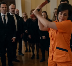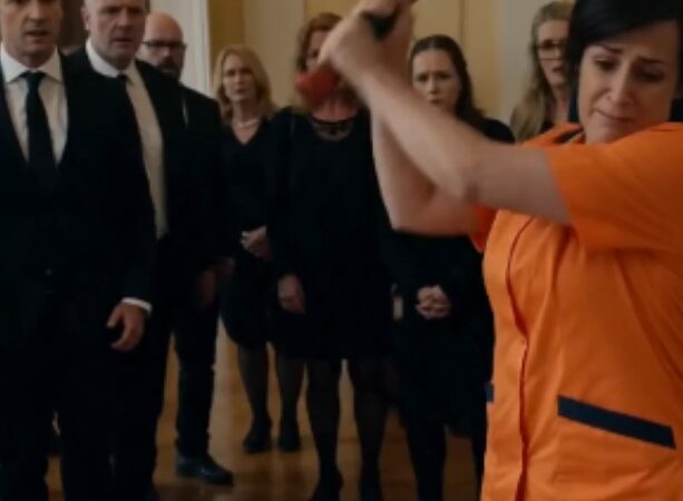 Der elegante Trauersaal lag in schwerer Stille. Beige Wände, schwarzer Stoff, polierter Boden, der weiße Sarg in der Mitte des Raumes. Trauernde standen regungslos wie Figuren aus Stein. Dann zerfetzte im ersten Augenblick ein brutaler Axtschlag die Ruhe. Das Dienstmädchen in orangefarbener Uniform sprang nach vorn und rammte die Axt mit voller Kraft in den Sargdeckel. HOLZ EXPLODIERTE. Splitter flogen durch die Luft. Frauen schrien und taumelten zurück.