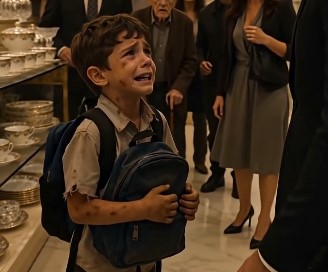 The luxury showroom glowed with warm designer light, endless shelves of crystal dishes and porcelain sets sparkling over polished marble—then disaster exploded in the first second. A tiny boy in a torn school uniform brushed past a display, his ripped sleeve catching the edge. An entire row of crystal dishes tipped forward. SMASH. Plates shattered across the floor in a deafening cascade. Every shopper froze. The boy stumbled backward in terror, dirty face already crumpling into tears. Silence slammed over the store. Then the manager stormed forward in heels, fury sharp in every step. “Do you know what you did?!” she snapped. The boy shook violently.