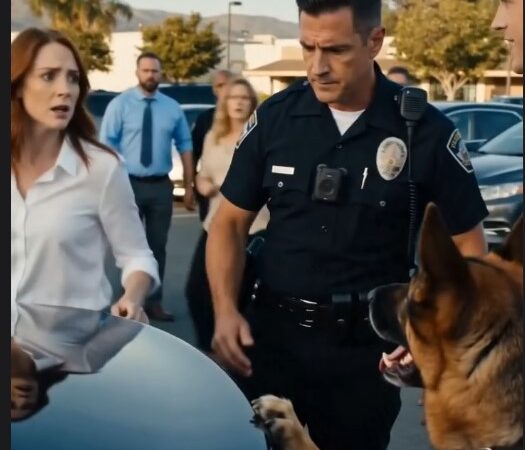 Afternoon heat shimmered over the crowded parking lot, cars gleaming beneath the sun, when chaos erupted in the first second. CLOSE-UP—sharp claws violently SCRATCHED across the trunk of a sleek black sedan. A German Shepherd attacked the metal with frantic urgency, barking in short desperate bursts, paws slamming again and again. People turned instantly. Conversations died. A sharply dressed woman rushed into frame, panic hidden beneath anger. “Stop! My car!” she shouted, grabbing for the leash that wasn’t there. The dog ignored her completely and clawed harder, nose pressed to the seam of the trunk. A man beside her forced an uneasy laugh. “It’s just a dog. Nothing’s in there.” The camera whip-panned to a police officer stepping forward, hand raised, eyes narrowed. “Back away.” Fast footsteps on asphalt. The crowd parted. Silence spread. The dog paused, looked directly at the officer… then hurled itself against the trunk again. Harder. The officer’s expression changed. He moved to the handle. The woman’s composure cracked. “Wait…” she whispered. Heartbeat sound rising. The officer yanked the latch.