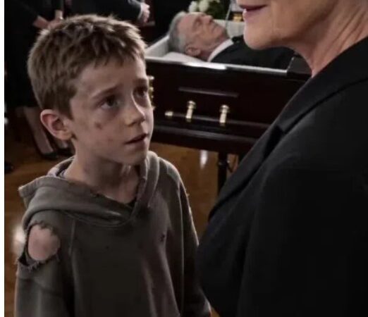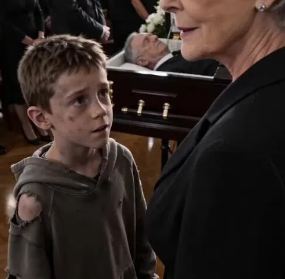 The funeral room was heavy with silence. White flowers surrounded the open casket, mourners dressed in black stood motionless, and the polished wood floor reflected the soft indoor light. A shaky phone camera captured the moment no one expected. Beside the casket stood a six-year-old boy in a torn oversized hoodie, dirt on his face, small but fearless. He looked up at an elegant older woman and said clearly, “He said if he died… you would take me.” Heads turned instantly. The woman spun toward him, confused and offended. “Take care of you?”