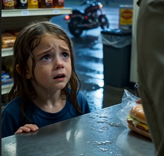 Rain pounded the highway gas station roof so hard it nearly drowned out the thunder. Neon lights flickered across the wet asphalt outside where a line of motorcycles stood like dark statues. Inside, the small station smelled of coffee, gasoline, and cold nights. A few bikers waited near the machine in silence when chaos hit in the first second. A soaked little girl in a blue outfit reached toward a wrapped sandwich on the counter. The owner snatched it back so hard it slammed against the register. She flinched violently. “Get out, kid,” he snapped. Her bright blue eyes filled with tears at once. Water dripped from her hair onto the floor as she shivered. “I’m so hungry…” she whispered, voice barely there. The bikers watched. Most looked away.