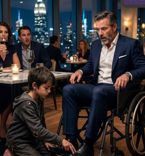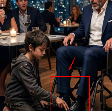 His small hand reached toward the man’s foot resting on the wheelchair plate.