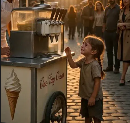 Tears ran down her cheeks as she stood beside the old ice cream cart.