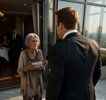 At the entrance of the luxury terrace stood an elderly homeless woman in worn clothes, thin shoulders trembling in the sunlight.